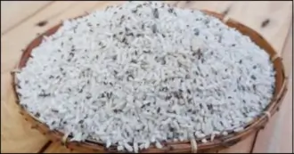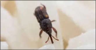 쌀벌레가 쌀을 먹은 흔적으로, 쌀 표면에 갈색 또는 검은색 반점이 나타날 수 있습니다.